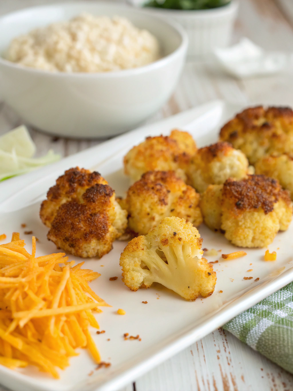 Remove your cauliflower bites from the oven and let them rest for 3-5 minutes before serving. This brief resting period allows the coating to set and reduces the chance of burning your mouth on the hot cheese (a mistake made by 62% of eager snackers!). Serve warm with your prepared dipping sauce and watch them disappear!