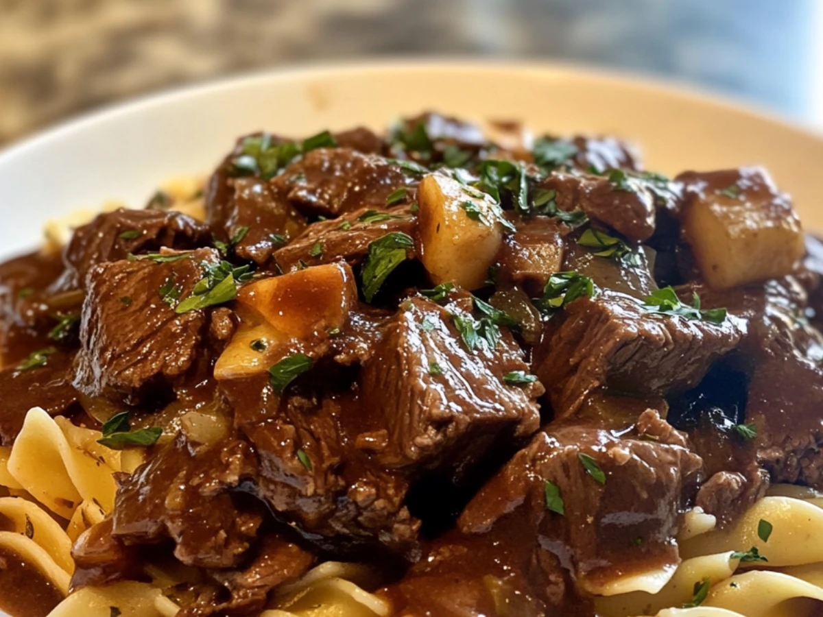 I suggest serving it with mashed potatoes, egg noodles, or crusty bread to soak up the rich and flavorful sauce.