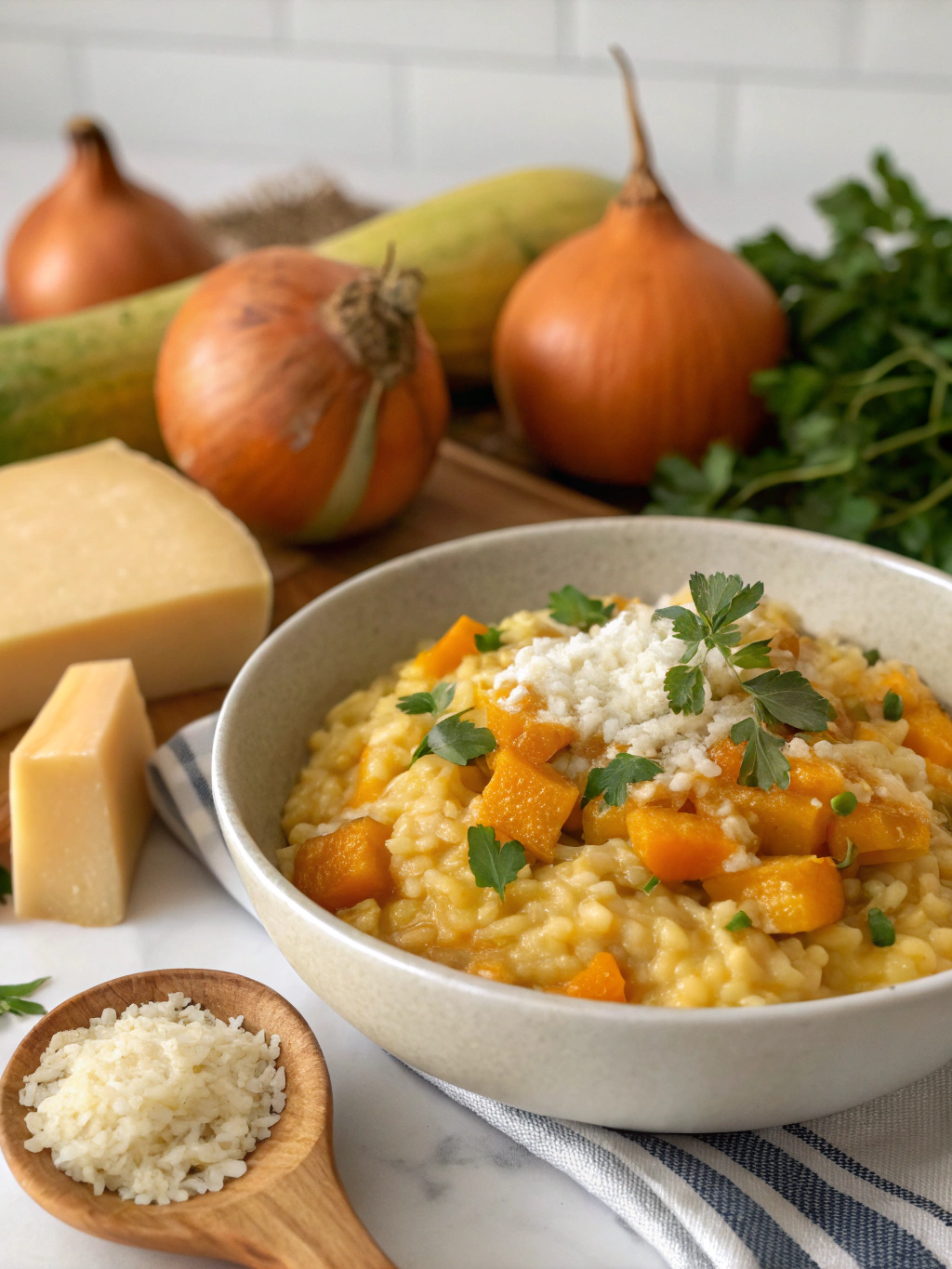 A: Yes! For pressure cooker preparation, sauté the onions, garlic, and rice as instructed. Add all the broth at once, then cook on high pressure for 6 minutes followed by a quick release. Stir in the roasted butternut squash, Parmesan, and herbs after releasing pressure.
