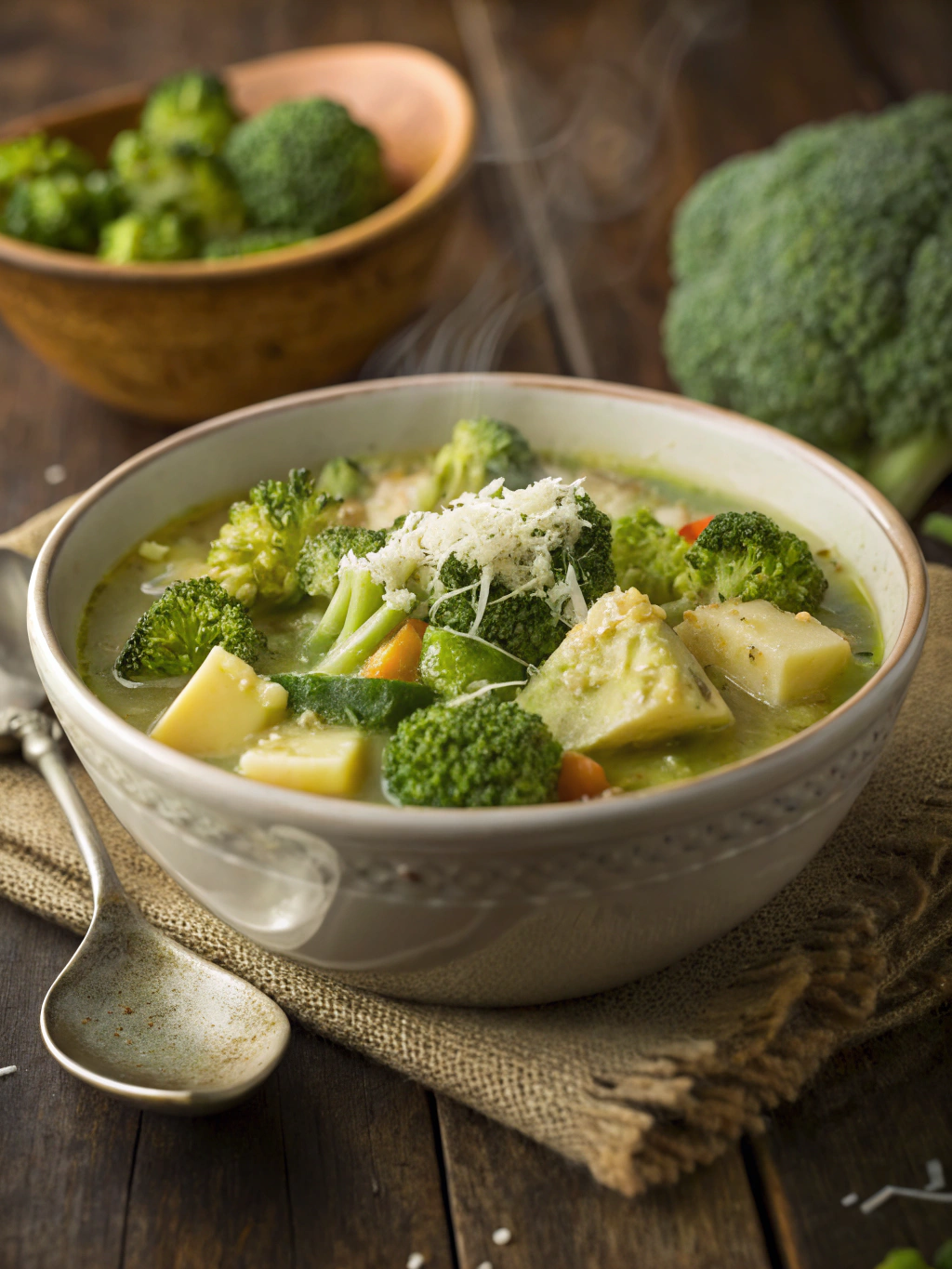 The vibrant green broccoli, golden potatoes, and orange carrots create a colorful base, while the aromatics infuse the soup with an irresistible fragrance that will fill your kitchen with comfort.