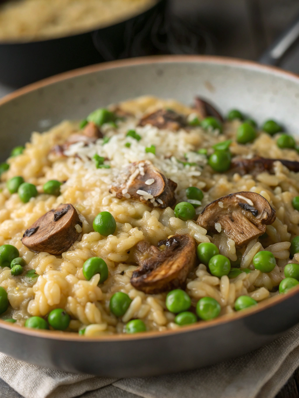 The combination of earthy mushrooms and sweet peas creates a symphony of flavors in each bite, while the Arborio rice releases its starches to create that signature creamy texture without adding heavy cream.