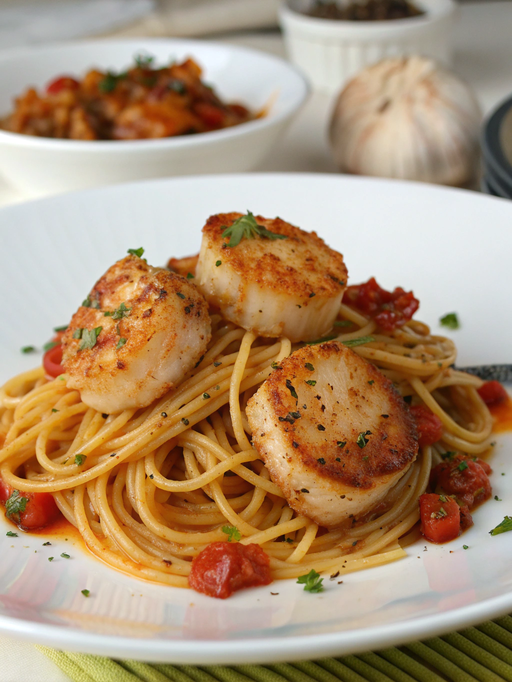 Elevate your Spaghetti with Spicy Scallop Marinara with these complementary side dishes and presentation ideas: